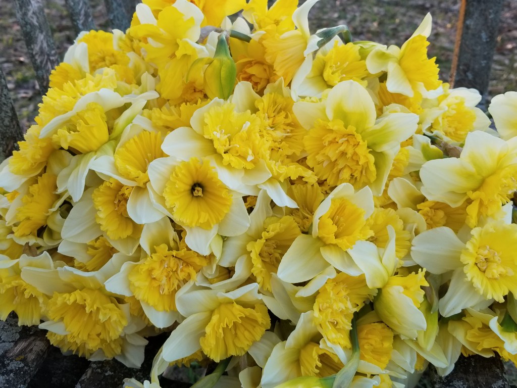 While you might not be the biggest fan of classic daffodils – you know the ones with the large, bright yellow trumpets and petals – there are thousands of varieties available ( over 16,000! – not joking – which is pure craziness) in super springy colors ranging from white, to pale cream, to coral and apricot and all shades of yellow (pale, bright, and in-between). There are ruffled varieties, double varieties, tiny and delicate varieties, and large and sturdy varieties. Also, daffodils may be lightly scented, unscented, or strongly scented. With so many daffodils to choose from there is bound to be a daffodil for everyone. Currently we have almost 10,000 daffodil bulbs planted (9,345 give or take a few) in over 20 varieties and we try to add more each year.